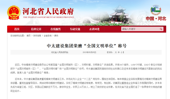河北省人民政府網(wǎng)站報(bào)道了中太建設(shè)集團(tuán)榮膺“全國(guó)文明單位”稱(chēng)號(hào)