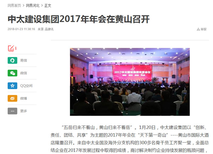 網易報道了“中太建設集團2017年年會在黃山召開”