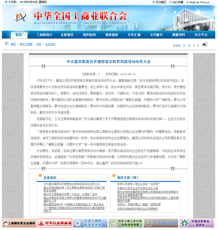 全國(guó)工商聯(lián)網(wǎng)站8月14日?qǐng)?bào)道了中太建設(shè)集團(tuán)召開理想信念教育實(shí)踐活動(dòng)動(dòng)員大會(huì) |
