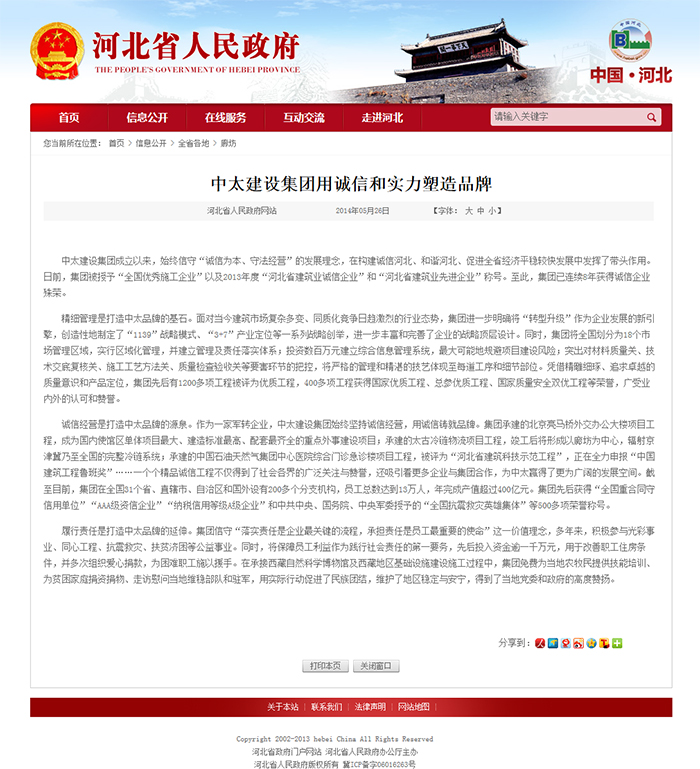 河北人民政府網站報道了中太建設集團用誠信和實力塑造品牌