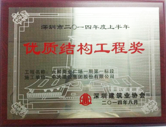 8月28日,深圳建筑業(yè)協(xié)會發(fā)布“關(guān)于表彰2014年度上半年深圳市優(yōu)質(zhì)結(jié)構(gòu)工程獎的決定”公告。第二工程局承建的房建項目“六和商業(yè)廣場一期第一標(biāo)段”榮獲深圳市2014年度上半年優(yōu)質(zhì)結(jié)構(gòu)工程獎。