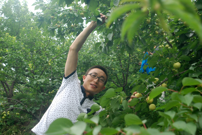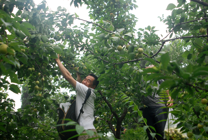盡管空氣潮濕,路面濕滑,但阻擋不了大家采摘的熱情。面對著綴滿枝頭的杏兒,大家早就沒有平日里的文雅和羞澀,翹腳、彎枝,瞄準了那大個地、泛著紅暈的京白杏兒,熟練地采摘。
